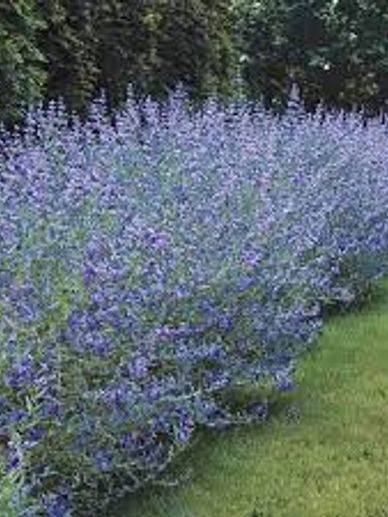 A low-mounded, deciduous shrub valued for its aromatic foliage and late summer flowers which are said to resemble clouds of blue smoke or mist. Flowers are very attractive to butterflies, bees and other pollinators. Height 2-4 feet and width 2-4 feet. Blooms July to September. Longwood Blue is a superior clone of the Blue Mist shrub.