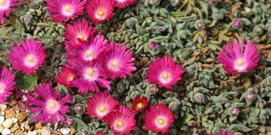 Delmara Pink Ice Plant has pink, daisy-like flowers covering a spreading mat of succulent blue green foliage. Wonderful as a ground cover or wandering through stepping stones. Delmara Yellow, Ocean Sunset Orange Glow, and Ocean Sunset Violet will also be on hand this year.