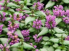Lamium, also called Spotted Dead Nettle, is a semi-evergreen, mat-forming perennial noted for its heart-shaped, silvery-green leaves with wide dark green edges. Attractive purple flowers appear in late spring and continue sporadically into fall. Pictured is Purple Dragon Lamium but White Nancy and Pink Pewter are also available.