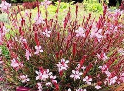 Gaura Passionate Blush is a compact perennial whose new growth is burgundy with masses of ruby colored buds on short, dark red stems which open to deep pink blossoms from spring to fall. 2' tall and wide.